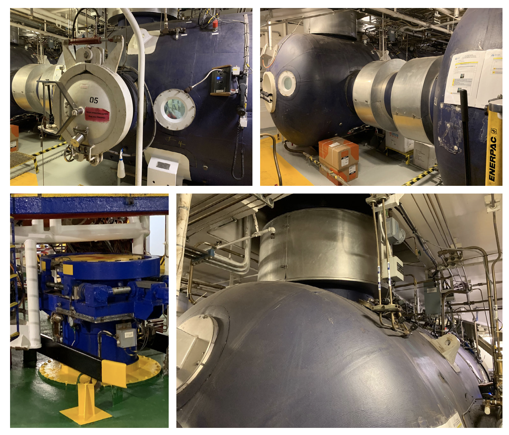 Top left: External view of chamber and adjoining trunking to left. Top right: Trunking between chambers and up to bell on left. Bottom left: Trunking entering bell hangar (bell off the hub trunking) Bottom right: Trunking to dive bell